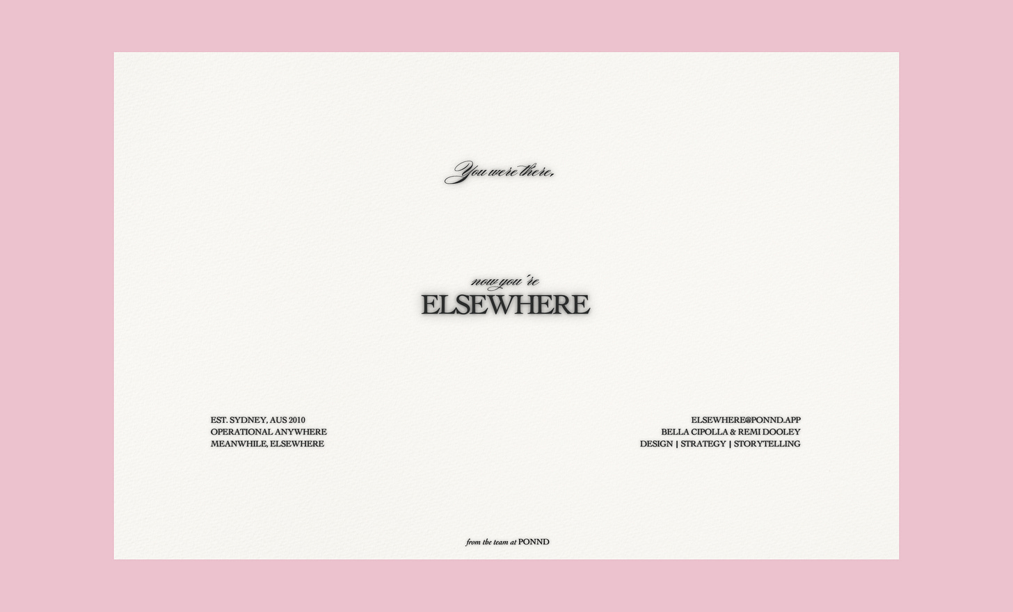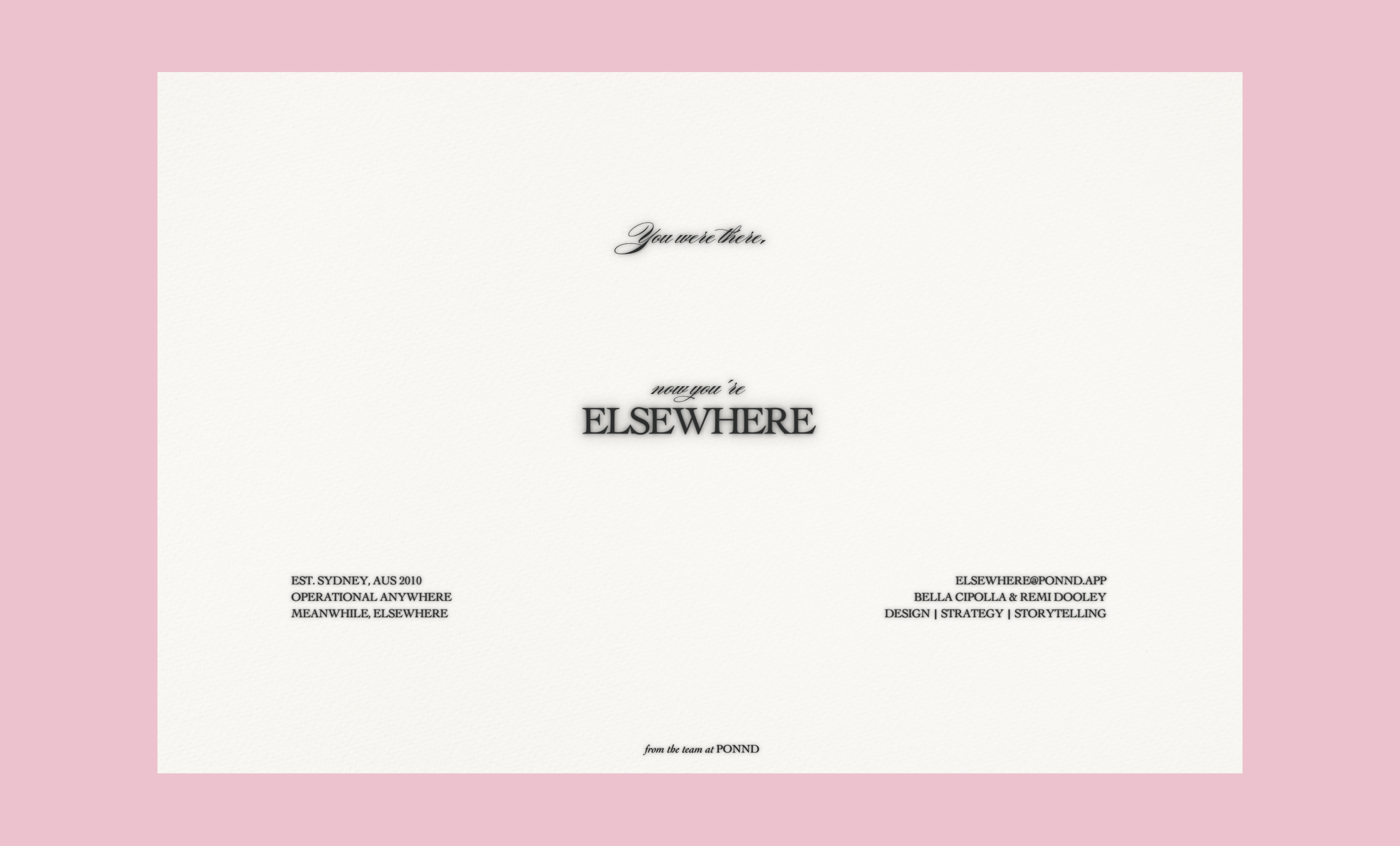 So from that lens, Bell and I decided we’d open Elsewhere by Ponnd. A studio focusing on our key skills: strategy, design, and storytelling.